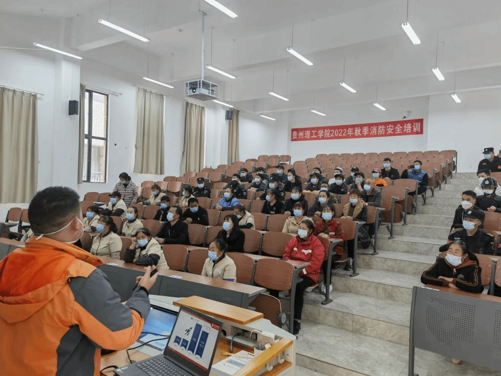 为全力打造平安校园,增强师生防火安全意识,普及消防安全知识,提高防火基本技能。11月24日中午,学校党委保卫工作部(保卫处)在贵安校区天工楼阶梯教室及广场针对2022级新生、新进班主任、新进辅导员以及食堂工作人员、物业工作人员以及商铺工作人员等开展消防安全知识培训讲座,本次培训活动由理论基础知识讲解和灭火器实操两部分组成。