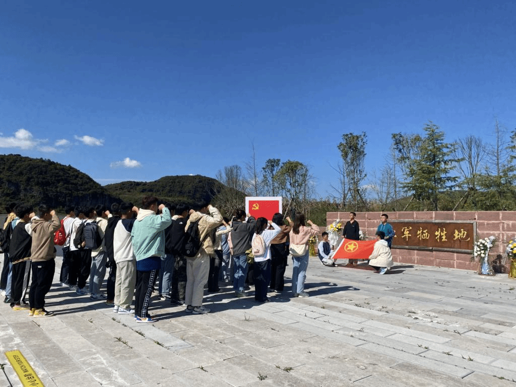 中央红军在贵州的革命活动,铸造了中国红色革命伟大的转折,红军长征兵临贵阳战役更是其中不可或缺的一页。兵临贵阳展示园是以中央红军兵临贵阳战役为主题,集主题展示、文旅融合、红色教育、民俗文化等为一体的红色研学目的地和长征国家文化公园贵州省南片区集散地。进入园区,能明显感受到长征国家文化兵临贵阳核心展示园区的庄重和威严。在红军牺牲地的碑前,同学们重温入团誓词,共青团员的使命和光荣油然而生。重走部分长征路,感受战士们当年走过的乡路、生活过的村落,民风淳朴的村庄巷道中还保留着当时红军驻留时留下的标语。同学们深入了解了拥军坟、六方井等事迹,大家表示作为新青年,学习先烈们在艰苦岁月里不屈不挠的斗志和革命精神,把长征精神代代相传,为祖国奉献!
