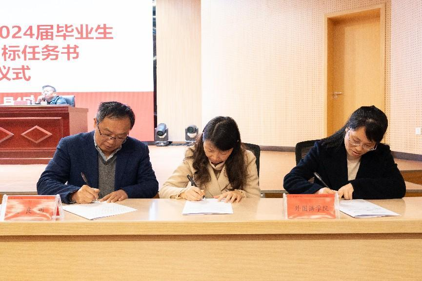 会上,潘良明与毕业生学院签订2024年就业工作目标任务书。材料工程学院、土木工程学院、大数据学院、航空航天工程学院分别作就业工作经验和征兵工作经验交流发言。