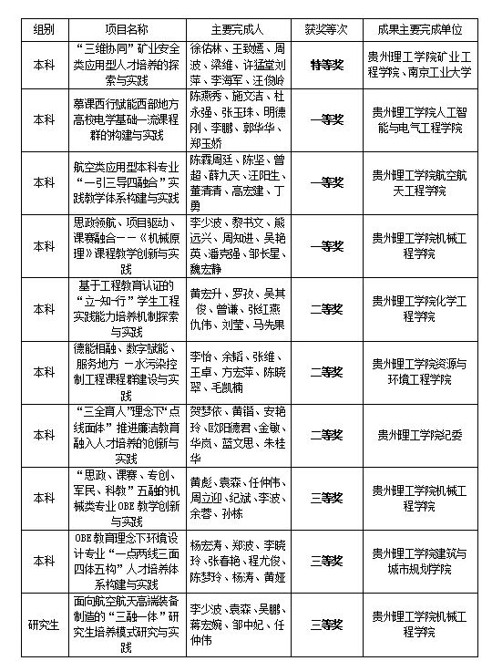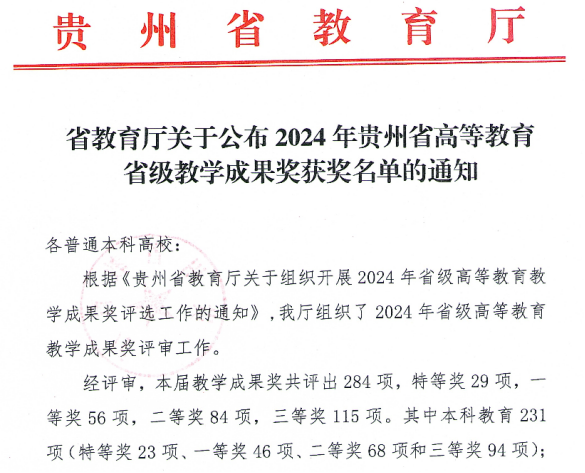 近期,省教育厅公布了2024年贵州省高等教育省级教学成果奖获奖名单,中国足球彩票:10个项目获奖,其中:获本科教学成果奖9项(特等奖1项、一等奖3项、二等奖3项、三等奖2项),获研究生教学成果奖三等奖1项。