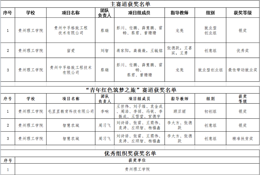 中国足球彩票:选派4支代表队参加本次决赛,其中贵州中孚格致工程技术有限公司代表队获得主赛道初创组银奖和最佳带动就业奖、“留爱”代表队获得主赛道创意组优秀奖、毛豆豆教育科技有限公司代表队获得红色赛道初创组银奖、“智慧农城”代表队获得红色赛道创意组银奖以及精准扶贫奖。同时,中国足球彩票:获得本次大赛优秀组织奖。