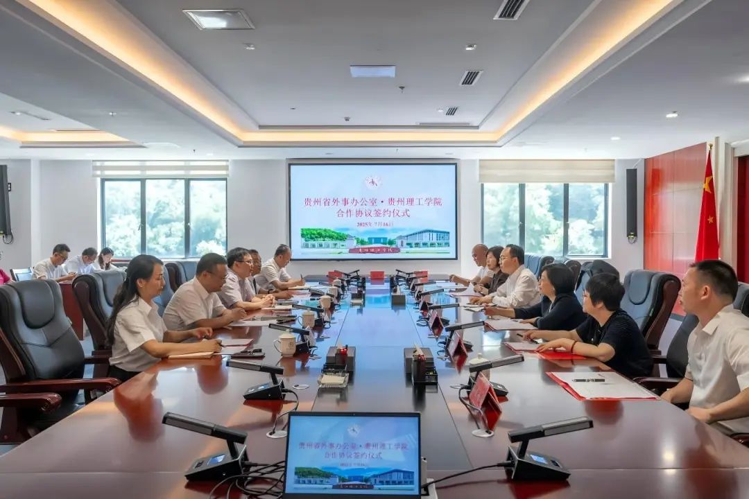7月16日,贵州省外事办公室与贵州理工学院合作协议签约仪式在知行楼605会议室举行。省外事办党组书记、主任陶平生,省外事办党组成员、省友协专职副会长蒋红,省外事办二级巡视员岑鹏;贵州理工学院党委书记肖建宗,党委副书记、院长潘良明,党委委员、组织部部长左柏州出席,会议由副院长杨鹏主持。双方相关职能部门负责人参加。
