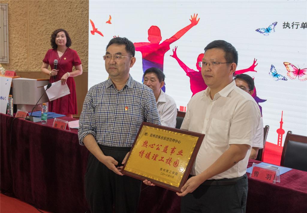 曾羽代表贵州理工学院向贵州省体育彩票管理中心赠送纪念牌匾。贵州省体育彩票管理中心主任代表体彩中心向贵州理工学院捐赠20万元资助款。
