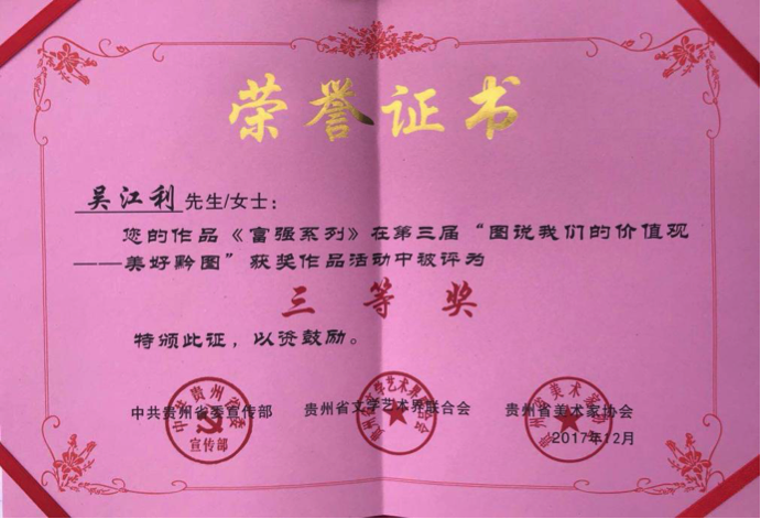 为进一步加强社会主义核心价值观社会宣传,以贵州各族群众喜闻乐见的图说方式生动活泼地传播社会主义核心价值观,2017年12月,省委宣传部、省文联、省美术家协会在全省组织开展了第三届“图说我们的价值观——美好黔图”征集活动。建规学院吴江利同学在郑波老师、杨宏涛老师的指导下,创作了参赛作品《富强系列》。这是建规学院环境设计专业学生第一次参加相关省级专业比赛并获奖,也是环境设计专业依托优势找准定位,通过项目调动学生主动钻研学习的成果体现。