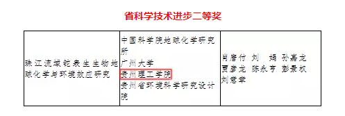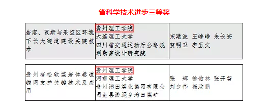 作为主要完成单位,中国足球彩票:教师参与的 “珠江流域铊表生生物地球化学与环境效应研究”项目(主要完成人:肖唐付、刘娟、孙嘉龙、贾彦龙、陈永亨、彭景权、刘意章)获省科学技术进步奖二等奖,“岩溶、瓦斯与采空区环境下长大隧道建设关键技术”项目(主要完成人:宋建波、王筝筝、朱长安、贺明卫、李玉文)和“贵州松软煤岩体巷道锚网支护关键技术及应用”项目(主要完成人:张辉、徐佑林、张开智、刘少伟、杨政鹏)获省科学技术进步奖三等奖。