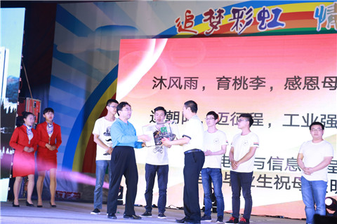 校党委书记曾羽、副校长梁杰代表学校上台接受13级小伙伴们用四年所学制作的毕业设计作品—机器人小创作为赠送给母校的礼物。曾羽书记代表学校向学子们送上殷切祝福:感谢同学们四年的努力和付出,祝愿同学们顺利毕业,祝福同学们人生出彩、精彩!