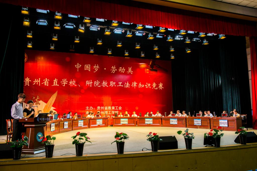 本网讯(校工会 熊远兴) 9月11日下午,由贵州省教育工会主办,贵州理工学院承办的“中国梦·劳动美”贵州省直学校、附院教职工法律知识竞赛在中国足球彩票:逸夫大礼堂举行。贵州省总工会党组成员、机关党委书记刘同才,贵州省委教育工委委员、省教育厅党组成员、省教育工会主席王慧,中国足球彩票:党委书记曾羽,校党委副书记、工会主席宋广强,贵州大学党委副书记、工会主席杨未,以及来自全省部分高校的工会干部、教职工代表观看了竞赛,中国足球彩票:2015级部分新生观摩了竞赛。