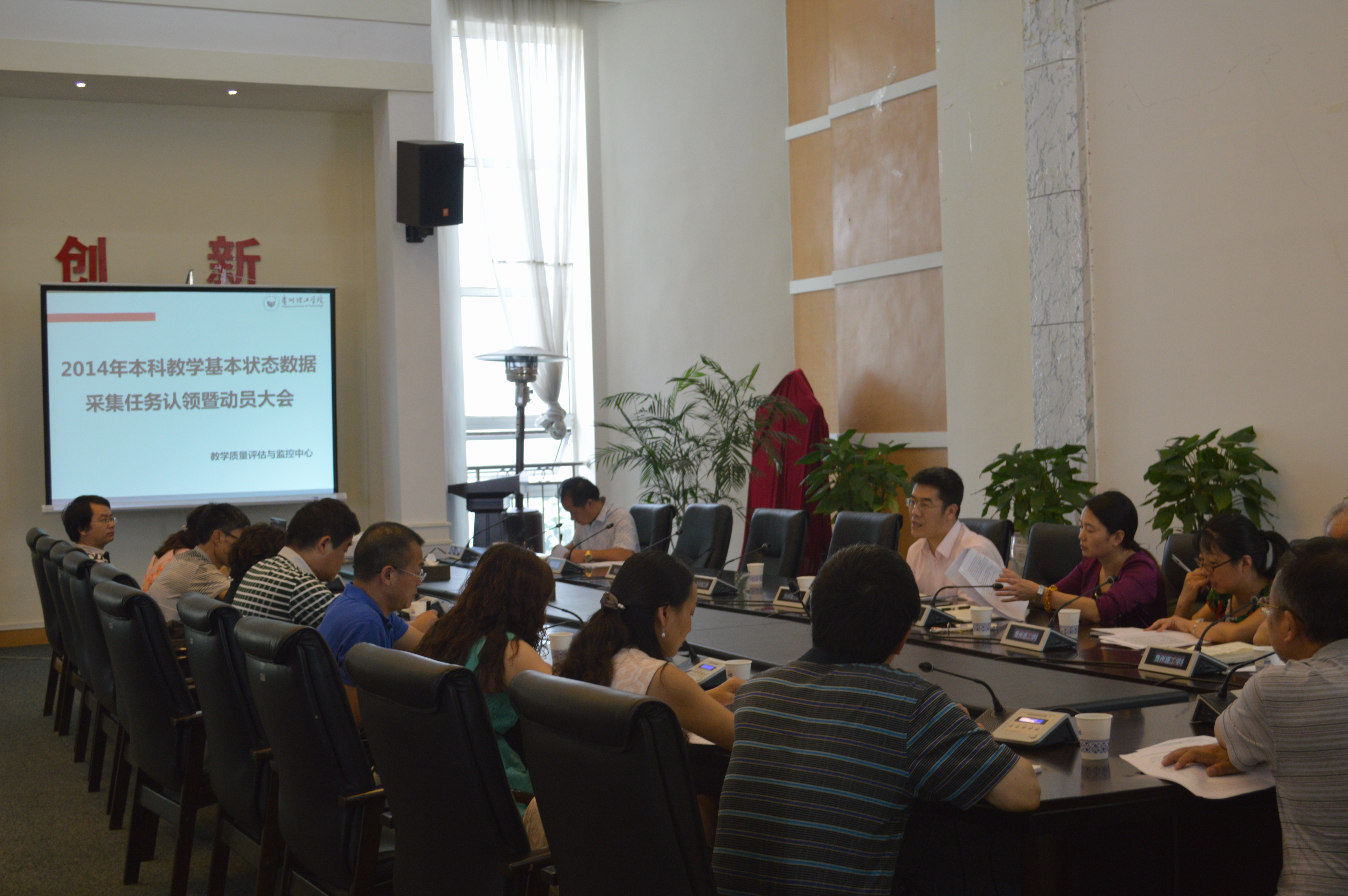 本网讯(丁阿丹) 9月11日上午,中国足球彩票:2014年本科教学基本状态数据采集任务认领暨动员大会在喀斯特三楼会议厅召开。校长龙奋杰、副校长王建平以及各教学单位、相关职能部门主要负责人参加会议。