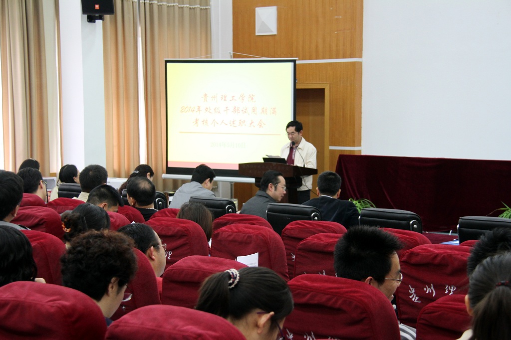 本网讯(和风) 5月10日,贵州理工学院2014年处级干部试用期满考核个人述职大会在喀斯特楼三楼报告厅举行,53名处级干部对一年来的履职情况进行了汇报。全体在家校领导出席述职大会。