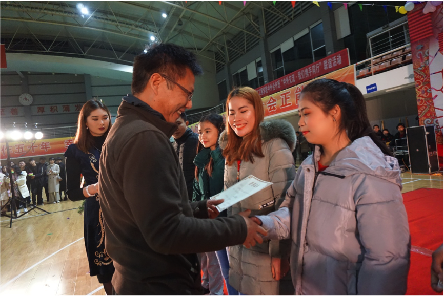 新年晚会在国际学生开场走秀中拉开帷幕。晚会形式多样,中外同学合唱、国际学生的相声、中国同学的小品,师生舞蹈以及老挝同学的啦啦操精彩纷呈,博得了全场观众的阵阵掌声。