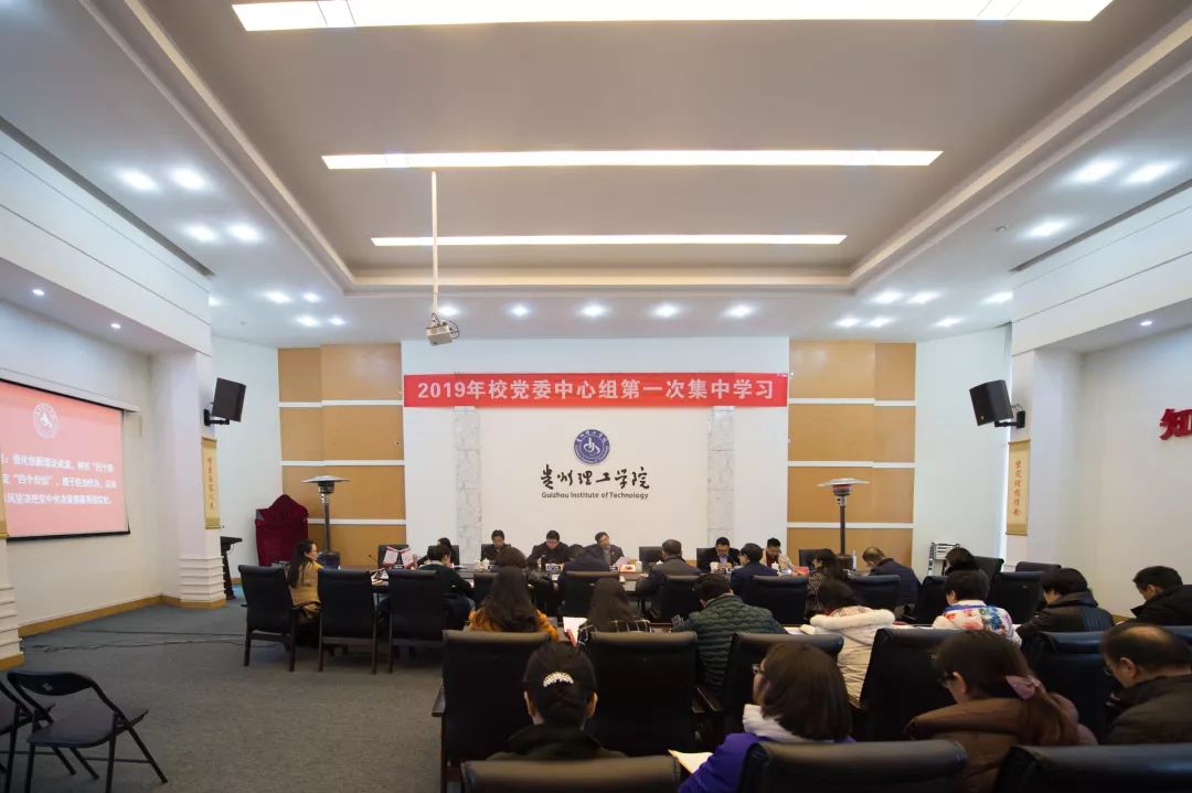 本网讯(党委宣传部 方燕)为认真学习贯彻习近平新时代中国特色社会主义思想,贯彻落实党的十九大精神和习近平总书记在贵州省代表团重要讲话精神,以新气象新担当新作为落实好党中央和省委各项决策部署,高质量开好2018年民主生活会,1月7日,以“强化创新理论武装,树牢‘四个意识’,坚定‘四个自信’,坚决做到‘两个维护’,勇于担当作为,以求真务实作风坚决把党中央和省委决策部署落到实处”为主题的2019年校党委中心组第一次集中学习会在喀斯特会议厅召开。校领导曾羽、张波、宋建波、苏向东、胡兴灿、贺梦依出席会议,梁杰列席会议,校直各部门、各教学(教辅)机构党政主要负责人参加学习。