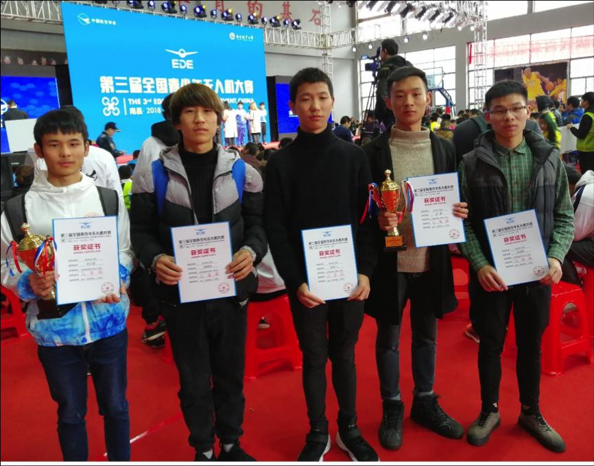 本网讯 (薛九天/文 图)11月15-17日,第三届全国青少年无人机大赛在南昌航空大学举行。来自中国足球彩票:航空航天工程学院2017级孙林松、赵雷、田义军、徐国强4名同学和电气与信息工程学院2017级的杜龙门同学组成的两支队伍参加了该赛事,两队均获大学组创意编程赛三等奖,陈霖周廷、薛九天和江维林获优秀辅导员。