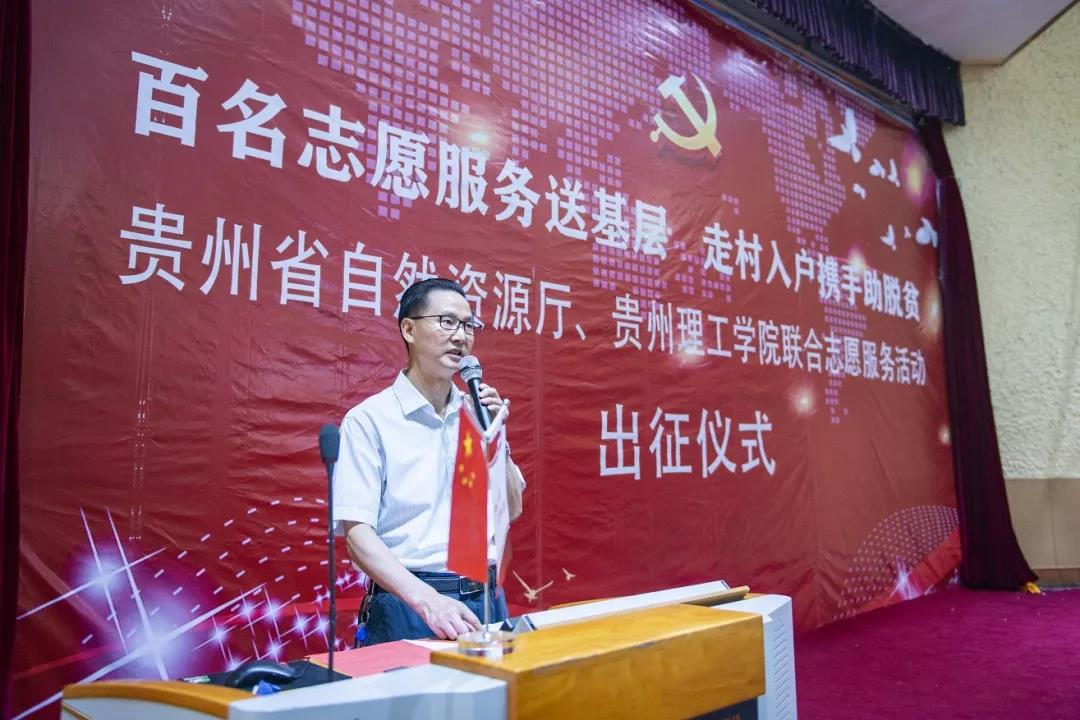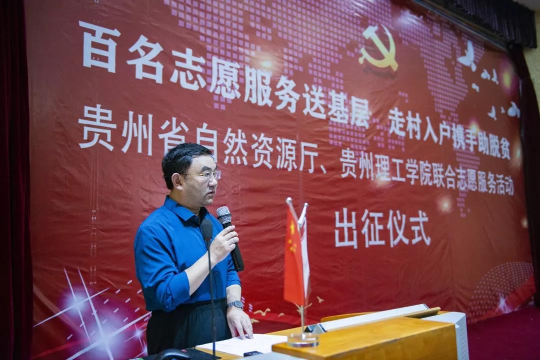 贵州省自然资源厅党委副书记、副厅长杨真贵讲话,他指出,贵州是全国脱贫攻坚的主战场,贫困发生率高于全国2.6个百分点,本次活动紧紧围绕省委省政府确定的大扶贫战略和脱贫攻坚夏秋决战来进行,是推进“不忘初心、牢记使命”主题教育,勇担脱贫攻坚政治责任的具体体现。他强调,同学们要把脱贫攻坚的时代伟业作为己任,高扬理想的风帆,坚定远大的志向,培养崇高的情怀,锤炼过硬本领,把自己的智慧、勇气和担当化为美丽的文字和诗句写入新时代贵州脱贫攻坚的壮丽诗篇。