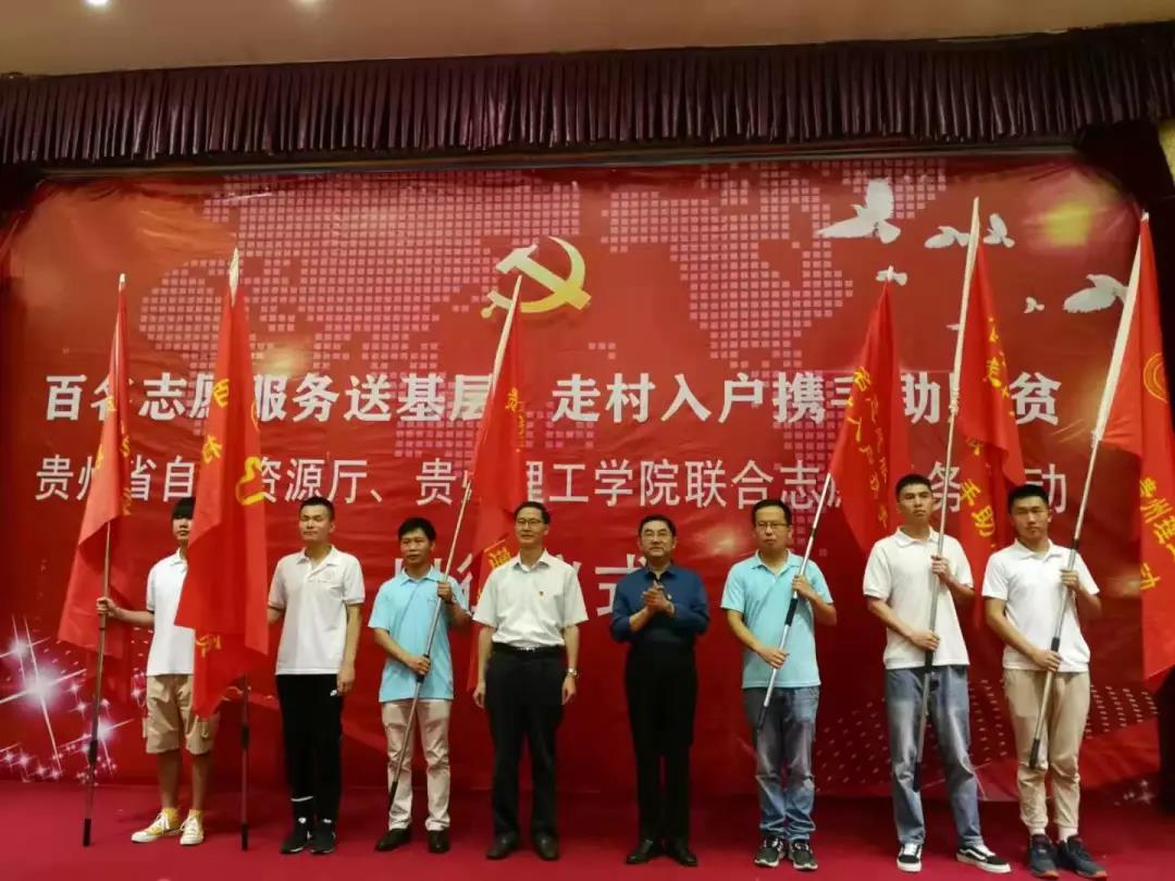 贵州理工学院党委书记曾羽与省自然资源厅党委副书记、副厅长杨真贵为百名青年志愿者团队授旗。