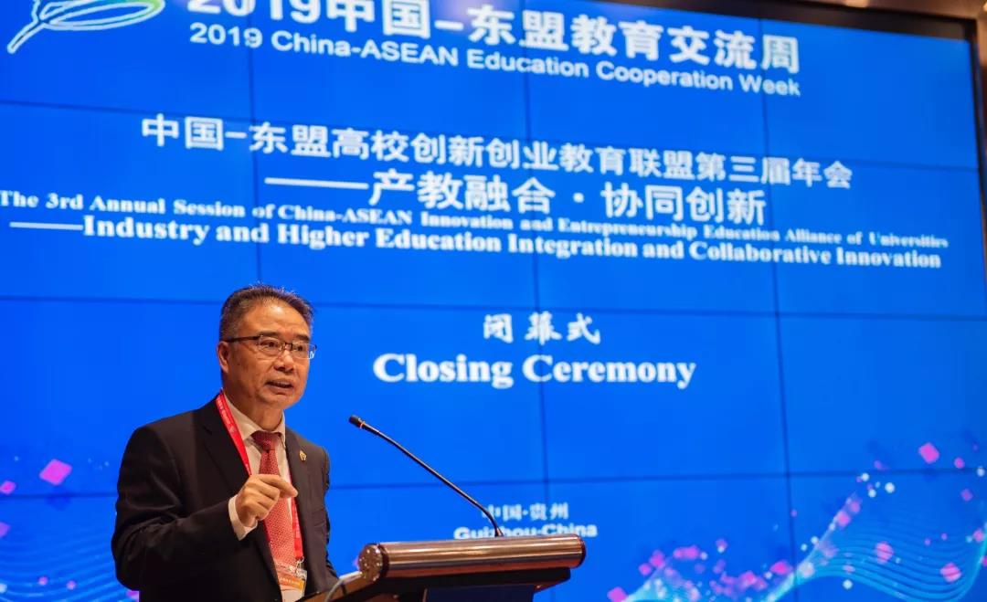 贵州理工学院党委书记曾羽致闭幕辞,希望充分运用好“中国-东盟高校创新创业教育联盟”取得的成果,推进产教融合人才培养改革,强化企业主体作用,提高行业企业参与办学程度,共同促进高等教育繁荣。同时,贵州理工学院将紧抓机遇,在创新创业教育领域与大家开展务实合作,深化中国与联盟国内外高等院校间的交流合作,完善人才培养协同育人机制作出不懈努力。