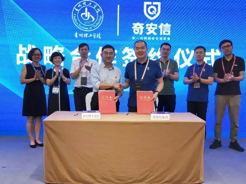 本网讯(电气与信息工程学院 王婷婷/文 国际交流与合作处 孙凯/图)8月22日上午,在国家会议中心举行的2019北京网络安全大会“智慧教育2.0网络安全论坛”上,贵州理工学院与奇安信集团签订战略框架合作协议。校党委书记曾羽、副院长梁杰,奇安信集团合伙人、副总裁何新飞、助理总裁夏伟、奇安信集团贵州区域总经理吴剑参加了签约仪式。
