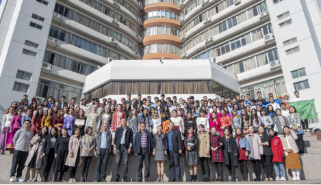 俄罗斯、老挝、孟家拉、乌兹别克斯坦、塔吉克斯坦、土库曼斯坦等国家的26名国际学生一起合唱了中国足球彩票:校歌《莫负好时光》。