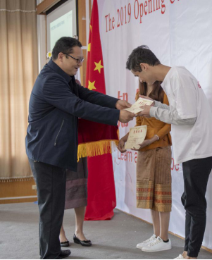 典礼上,宋建波还为2018—2019学年“海上丝绸之路”奖学金生代表颁发了荣誉证书。国际教育学院党政负责人分别为2018—2019学年“优秀国际学生”奖学金生代表、国际学生服务站的同学们颁发了荣誉证书和聘书。教师代表林苑老师、新生代表来自俄罗斯的国际语言生雅娜、国际学历生代表来自老挝金凤分别发言。