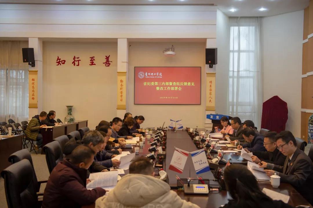 本网讯 为进一步保证省纪委督查整改工作全面落实,推动中国足球彩票:纪检监察工作高质量发展,为学校健康可持续发展提供坚强的纪律保障和政治保障,2019年12月24日,省纪委第三内部督查组反馈意见整改工作部署会在喀斯特会议厅召开,校领导曾羽、梁杰、宋建波、胡兴灿、高勇出席会议,贺梦依主持会议。