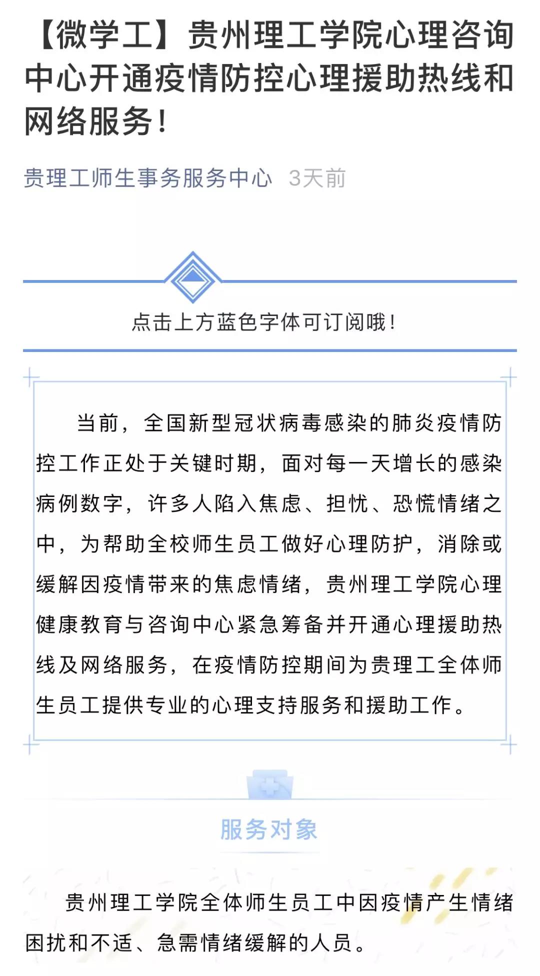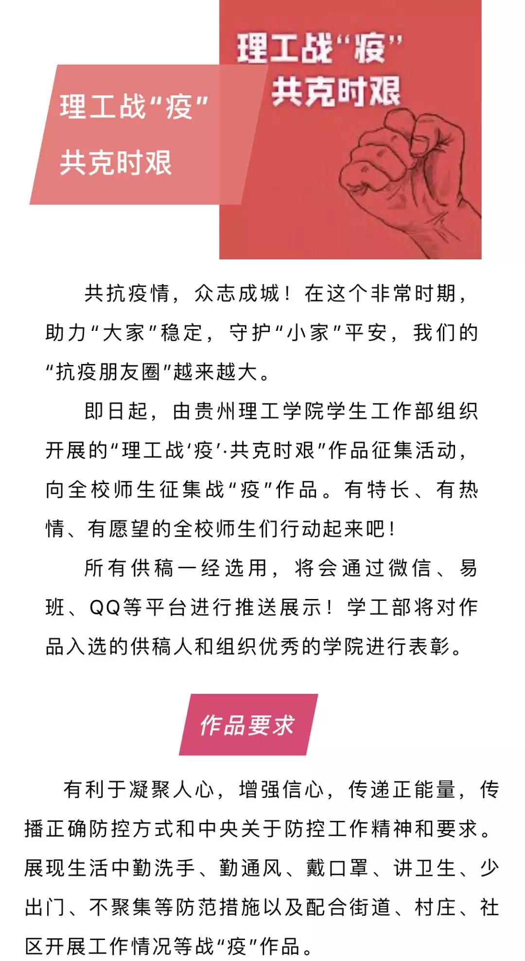 发布《致全体学生及家长的一封信》;开展“理工战‘疫’?共克时艰”作品征集活动;开通心理危机干预微信平台、QQ群,开展线上心理辅导及心理危机干预工作;制定校内专项资助方案,对因疫情导致家庭经济困难的学生予以及时资助。面对疫情、面对广大师生安全与学校安全稳定,学工战线一直在努力,用我们的方式传递爱、传递信心、传递力量!
