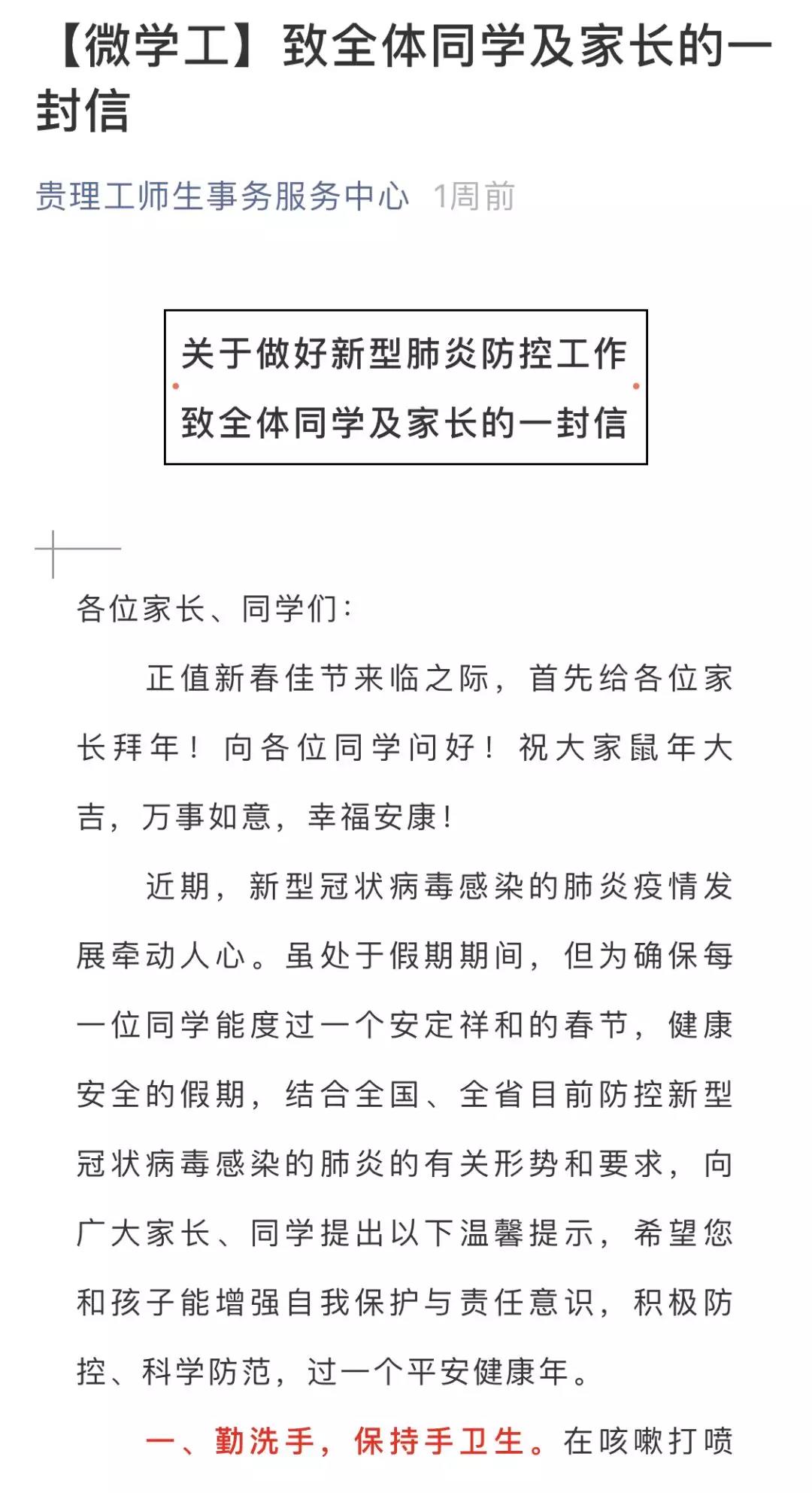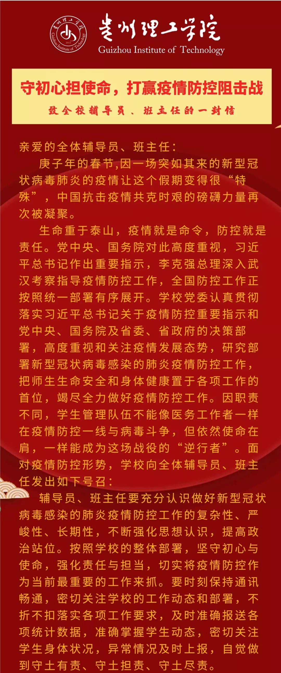 疫情就是命令,防控就是战斗。学生工作部向全校辅导员一对一发送工作提示,推送《守初心担使命,打赢疫情防控阻击战——致全校辅导员、班主任的一封信》。全校学工战线积极行动,学工部