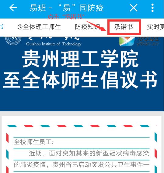 现正值学校寒假,但疫情防控应防范于未然,做好学校的防控工作,校团委、校学生会、易班共同推出“易”同防控承诺书,邀请各位理工学子积极响应参与,一起做好校园防控,保护自己,同时也对他人负责。请各位理工学子登录易班,按照以下操作进行: