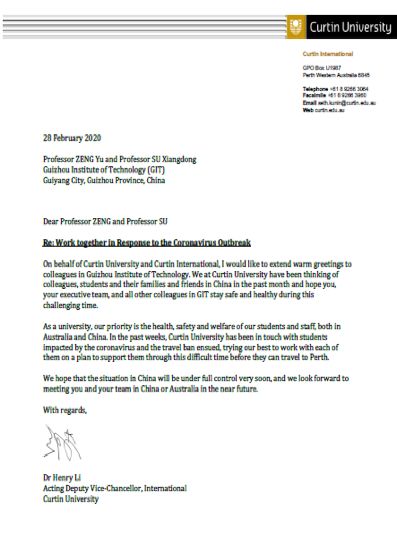 澳大利亚科廷大学国际事务院长在信中表示:“我们在过去的一段时间内一直挂念着在中国遭遇疫情影响的贵校的师生及他们的家庭朋友,希望贵州理工学院的所有同事在这段时间里都能够健康平安。科廷大学首要任务是确保澳大利亚和中国的学生和员工的健康、安全、福利,我们一直致力于帮助受疫情影响的学生以及在澳大利亚发布旅游禁令后,为不能返校的学生提供帮助。我们期望中国的疫情能够尽快得到控制,期待与你们的下次相见。”