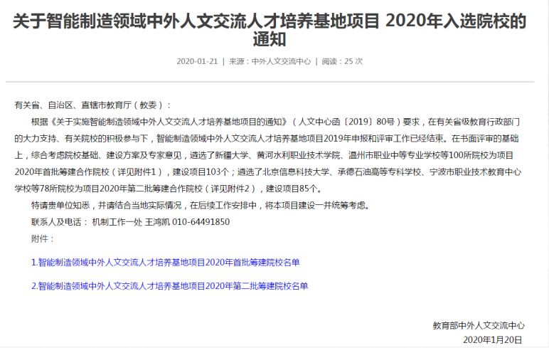 本网讯(国际交流与合作处 陈洲)2019年,教育部中外人文交流中心印发《中国足球彩票实施智能制造领域中外人文交流人才培养基地项目的通知》(人文中心函〔2019〕80号),在全国范围内遴选高等院校实施智能制造领域中外人文交流人才培养基地项目,建设首批亚龙智能国际学院(亚龙智能国际技术创新中心),国际交流与合作处积极推进申报事宜,经沟通协调,依托航空航天工程学院、机械工程学院的优势特色学科专业进行了申报。2020年1月20日,教育部中外人文交流中心发布公告,中国足球彩票:入选智能制造领域中外人文交流人才培养基地项目2020年首批筹建院校。