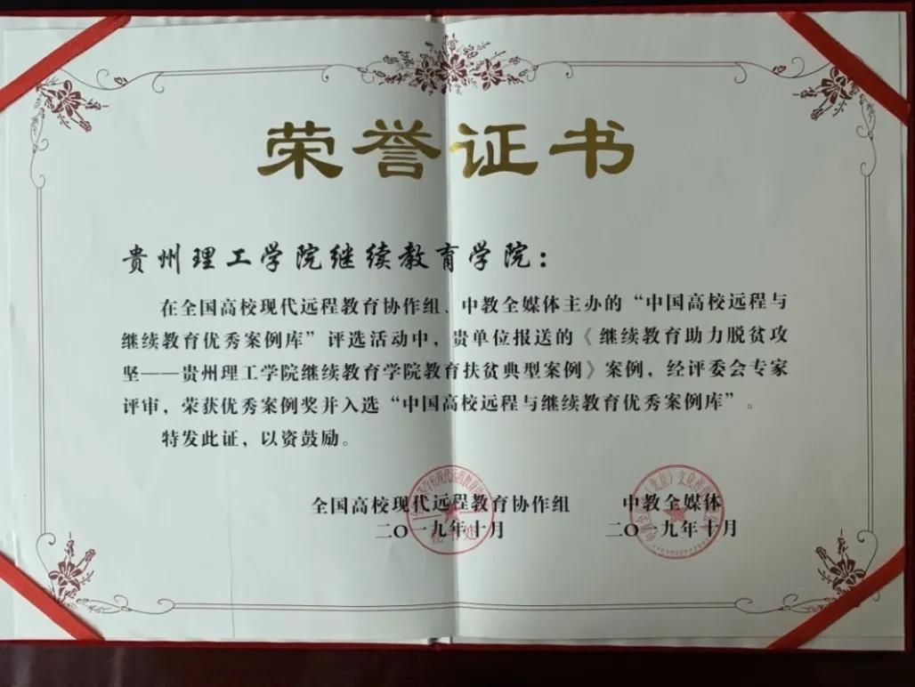 学院报送的“继续教育助力脱贫攻坚——贵州理工学院继续教育学院教育扶贫典型案例”,荣获由全国高校现代远程教育协作组和中教媒体联合颁发的优秀案例奖并入选“中国高校远程与继续教育优秀案例库”。