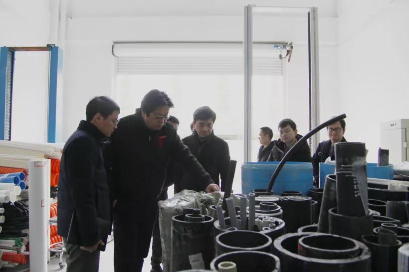 苏向东一行实地调研了混凝土性能检测室、化学建材综合检测室、大型构件检测室、水泥检测室、防水材料检测室、放射性检测室等专业实验室,在调研过程中针对磷石膏建材、新型水泥、特种玻璃、装配式建筑等技术问题与现场工作人员作了详细交流。