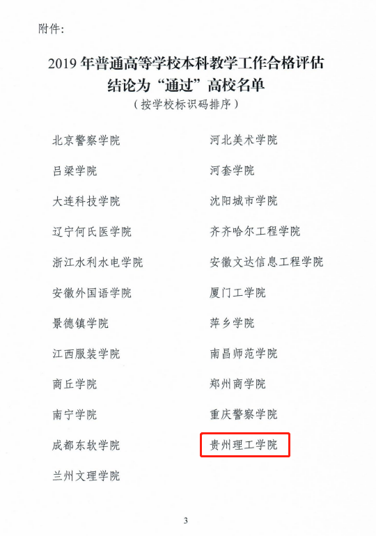本网讯(党委宣传部 杨涛)近日,国务院教育督导委员会办公室发布了《中国足球彩票公布2019年普通高等学校本科教学工作合格评估结果的通知》(国教督办函〔2021〕2号),公布了评估结果为“通过”的23所学校名单,贵州理工学院顺利通过教育部普通高等学校本科教学工作合格评估。
