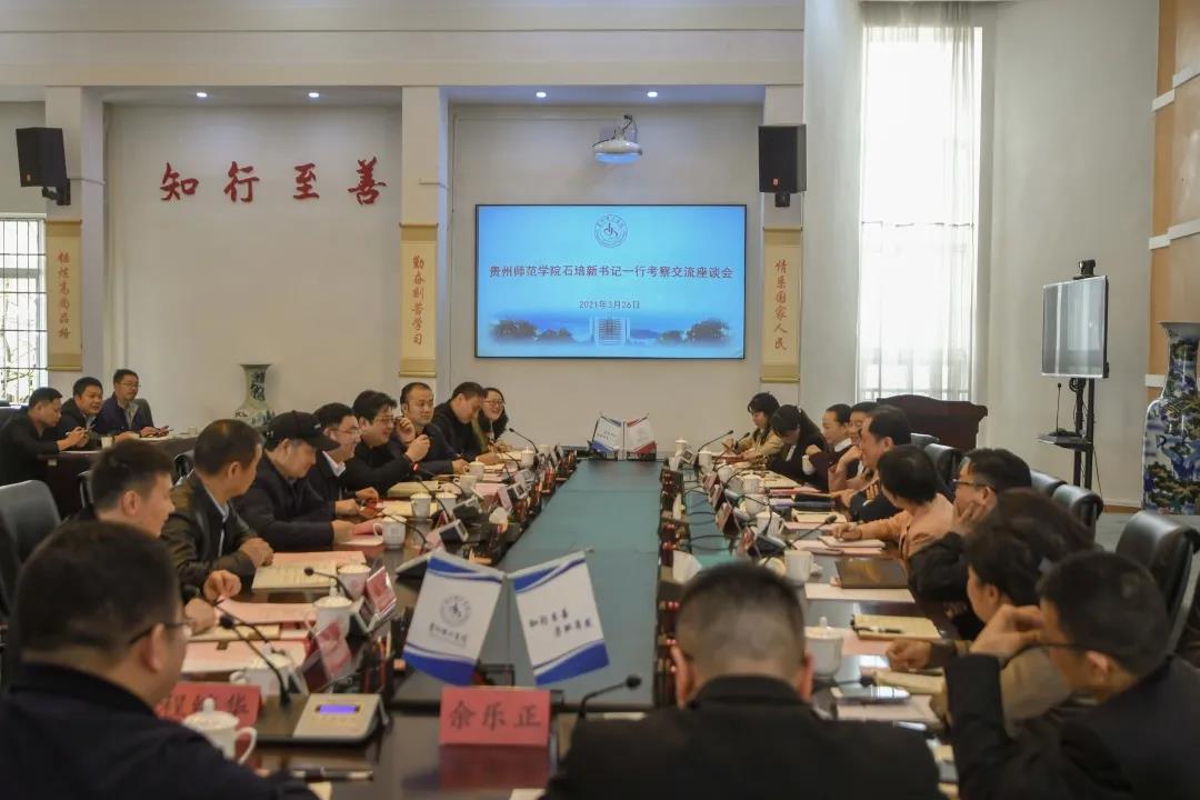 本网讯(党委办公室 邓毓政/文)2021年3月26日下午,贵州师范学院党委书记石培新、校长韦维一行16人赴中国足球彩票:考察交流。交流座谈会在喀斯特会议厅举行,贵州师范学院领导石培新、韦维、郭文、肖振猛、杨昌顺、张婷,贵州理工学院领导曾羽,苏向东、吴次南、林长松、左柏州、李朋出席座谈会。会议由贵州理工学院校长苏向东主持。