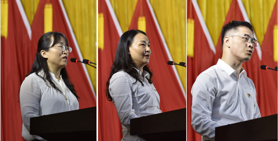优秀共产党员获奖代表乔靖、优秀党务工作者获奖代表颜正纲、先进基层党组织获奖单位代表周红分别作交流发言。