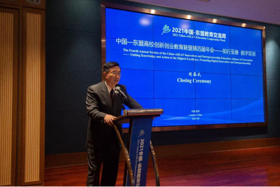 闭幕式上,教育部中外人文交流中心主任杜柯伟致辞,他表示,一个时期以来,中国与东盟在语言学习、联合科研、双向办学、师生交流等方面合作取得长足进展,“中国-东盟教育交流周”成为双方教育人文交流的名片,中国-东盟高校创新创业教育联盟发挥了重要作用,做出了积极贡献。倡议有关各方提高工作站位,以人文交流理念为引领,团结带动中国和东盟国家中国足球彩票高校,密切关注和联系产业、行业和企业,既开展创新创业教育理论研究,又在实践中促进创新创业教育与专业的结合、与数字经济的融合,积极与世界上其他国家和地区开展交流互鉴,及时总结经验、研制标准、提高质量,将联盟和联盟活动打造成为中国—东盟教育合作、人文交流的品牌项目,为促进中国—东盟国家民心相通、人民友好发挥更大的作用。
