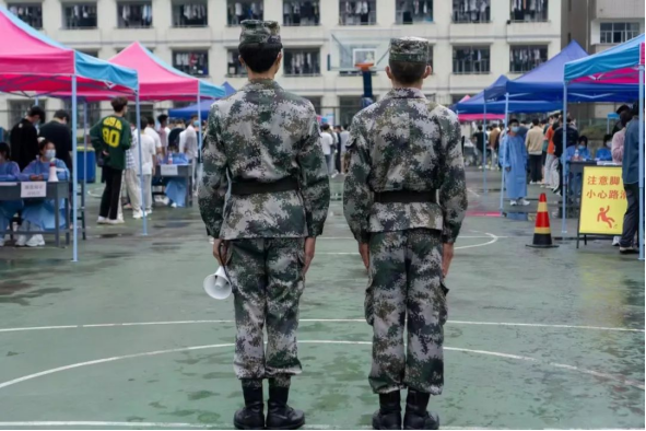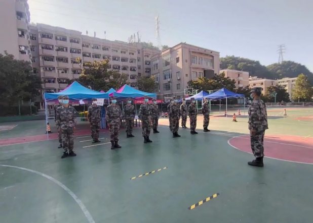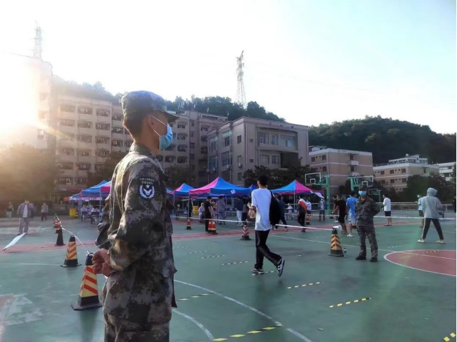 24名同学组成了这只退役军人志愿者队。其中,材料学院罗鸿伟同学刚从部队退伍返校,按照防疫规定解除隔离以后还没来得及办理入学手续,就投入到了紧张的防疫工作中,从军营到校园无缝衔接,没有一丝懈怠,真正体现了军人本色。在核酸现场,退役军人志愿者们正在耐心引导参加核酸检测的同学们。全员核酸采集是一个艰巨且重大的任务,这抹橄榄绿在现场坚守了长达5个小时,维护秩序、保障物资、指引通道,以平凡的身份在平凡的岗位上做着不平凡奉献,有效保障了采集任务的完成。