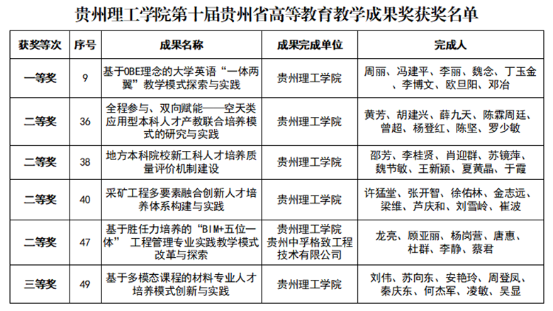 本网讯 (教务处)10月18日,贵州省教育厅发布了《中国足球彩票公布第十届贵州省高等教育教学成果奖获奖名单的通知》,中国足球彩票:6个项目分获一等奖、二等奖和三等奖。
