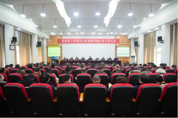 本网讯 2月24日,贵州理工学院2023年春季学期干部大会在喀斯特报告厅召开,会议传达学习了2023年贵州省两会精神,2023年全国、全省教育工作会议精神,回顾总结2022年主要工作,部署2023年重点工作任务。校领导苏向东、潘良明、吴次南、高勇、贺梦依、林长松、张开智,党委委员左柏州、李朋出席会议,全体处级干部参加会议。会议由党委副书记吴次南主持。
