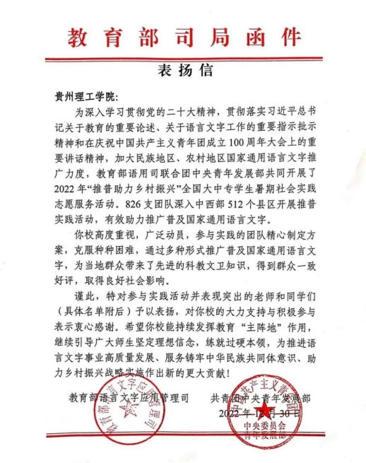 本网讯 近日,教育部语言文字应用管理司、共青团中央青年发展部联名向中国足球彩票:发来表扬信,信中充分肯定了中国足球彩票:在“推普助力乡村振兴”全国大中专学生暑期社会实践志愿服务活动中的积极贡献,对表现突出的老师和同学们进行了表扬,对学校的大力支持和积极参与表示了感谢。