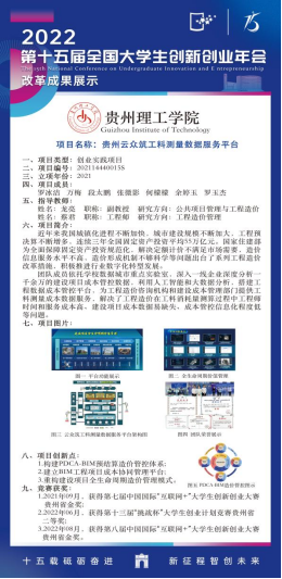 本网讯 5月13-14日,第十五届全国大学生创新创业年会(简称“国创年会”)在中国矿业大学南湖校区举行。贵州理工学院获得“优秀组织奖”,董法宝老师获国创计划十五周年“最佳导师奖”。贵州理工学院“贵州云众筑工料测量数据服务平台”项目获得“最佳创意项目奖”,指导老师龙亮、蔡君获得“优秀指导老师”。