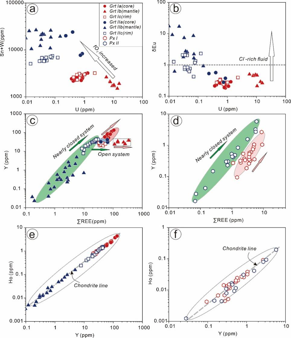 锡、铟等关键矿产资源在现代工业、科技及国防等领域具有不可替代的重要意义。贵州理工学院资环学院刘仕玉老师联合中国科学院地球化学研究所研究团队,以我国三大锡石硫化物矿床之一的云南都龙Sn-Zn-In多金属矿床为研究对象,通过对该矿床中两种石榴石的详细分析,开展原位微区 LA-ICP-MS U-Pb 定年及主微量元素分析,揭示了其形成环境和演化过程。这一成果不仅明确了矽卡岩形成时代,还为理解都龙矿床成矿机制提供关键依据,对同类矿床研究具有重要参考价值,助力我国矿产资源勘探取得新进展。