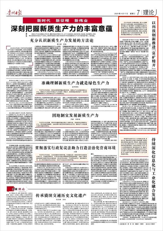 4月17日,《贵州日报》刊发科技处处长黄芳理论文章《以科技创新推进“富矿精开”》,全文如下: