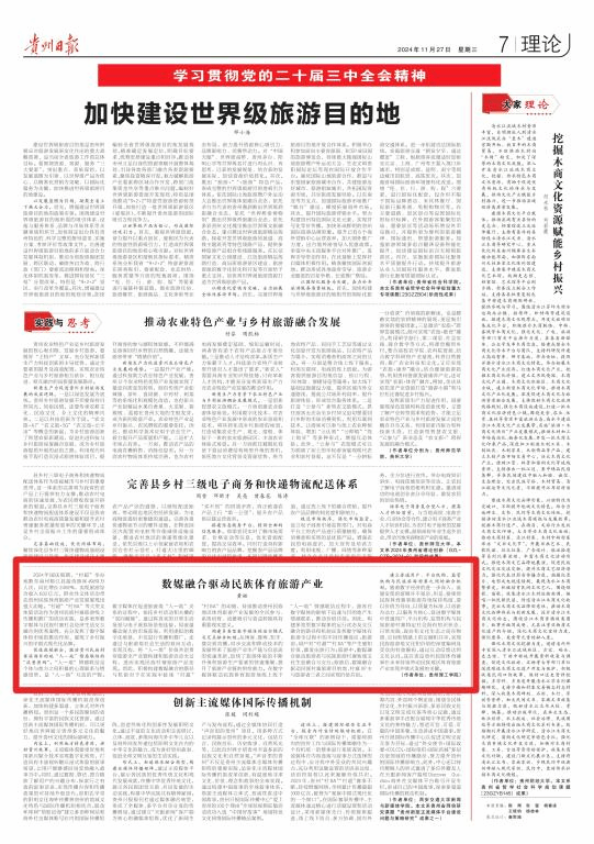 2024年国庆假期,“村超”举办地黔东南州榕江县接待游客49.89万人次,同比增长24.82%,实现旅游综合收入6.02亿元,群众性文体活动带动贵州民族体育旅游产业发展展现出强大动能。“村超”“村BA”等大型文体旅活动作为贵州民族村寨旅游线上传播和推广的成功实践,是多类型数字媒体与民族村寨社会经济生活交互融合的优秀案例,充分发挥了数字媒体和市场的推动作用,展现了乡村振兴的中国式现代化品牌。