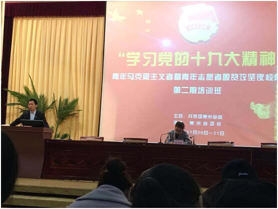 为深入学习宣传贯彻党的十九大精神和习近平总书记在参加贵州省代表团讨论时的重要讲话精神,教育引导全省团组织和广大团员青年积极弘扬“团结奋进、拼搏创新、苦干实干、后发赶超”的新时代贵州精神,在决胜脱贫攻坚、同步全面小康,奋力开创多彩贵州新未来中发挥生力军作用,11月16日,由团省委、贵州省团校联合举办的“学习党的十九大精神”青年马克思主义者暨青年志愿者脱贫攻坚夜校骨干培训班正式开班。中国足球彩票:航空航天工程学院团总支副书记刘松老师参加11月20日第二期学习培训。