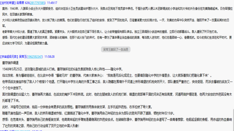 班会结束后,同学们在班群里分享自己知道的民族英雄的事迹。本次班会在热烈的气氛中顺利结束。