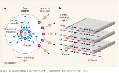 而当施加的电压足够大时,电极之间的空气可以产生足够的推力来推进小型飞机。理论上来说,使用非常高的电压时,基于 EAD 的推进器会在两个电极周围的空气中产生离子,电极之间产生的电场将离子从较小的电极“甩到”较大的电极上,这些离子在行进时与正常的空气分子碰撞,产生离子风并向前推动机器。另外,由于离子可以在两个固定电极之间移动,因此机器不需要活动部件来为其供电。