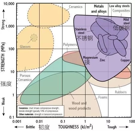 就拿碳纤维和我们常见的钢材来说,对比一下这两张图,碳纤维的强度在 400 到 800 兆帕左右,而普通钢材的强度为 200 到 500 兆帕。再来看韧性,碳纤维和钢材基本类似,没有明显的区别。