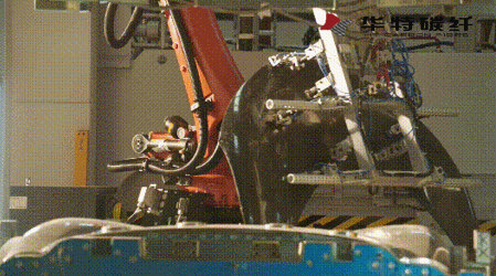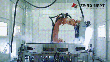 通过自动化搬运机器人,将预成型料送至模压机上进行模压成型(PCM),华特目前能做到5-10分钟成型,拥有800-1000吨压机,可成型各类大型工件。