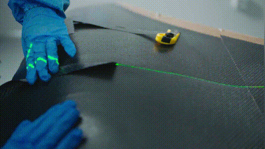 第二步在铺贴工装上进行预浸料铺贴,根据设计要求铺贴不同层数,所有过程都在激光定位下进行的。