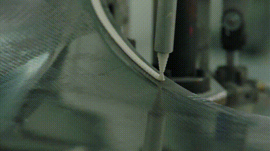 第六步在涂胶机器人工位打结构胶,涂胶位,打胶速度和出胶量都经过精准调试。部分与金属件连接件采用铆接方式,在铆接工位进行。