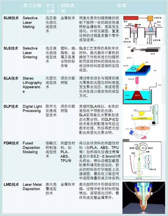 根据前瞻产业研究整理的2018年数据显示,当前光固化的设备占据中国市场主流,占比为39.8%,其次是选择性激光熔化及材料挤出设备。事实上,自20世纪80年代中期SLA成型技术发展以来,国内外已经出现了十几种不同的增材制造成型技术,目前在我国主流的增材制造技术包括SLA技术、SLM技术、SLS技术、DLP技术、FDM技术、LMD技术等。